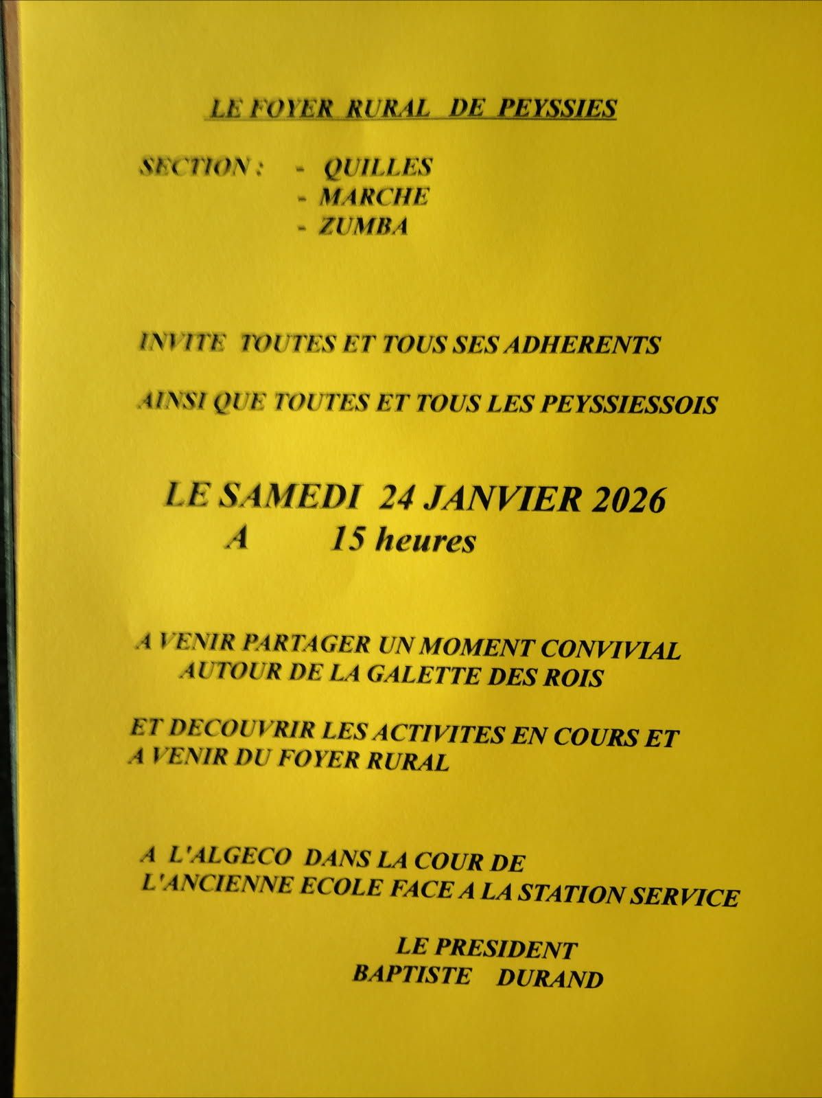 Les sections quilles, marche et zumba invite tous ses adhérents ainsi que tous les peyssissois à partager un moment convivial autour de la galette des rois, et à découvrir les activités en cours et à venir du foyer rural. le samedi 24 janvier 2026.