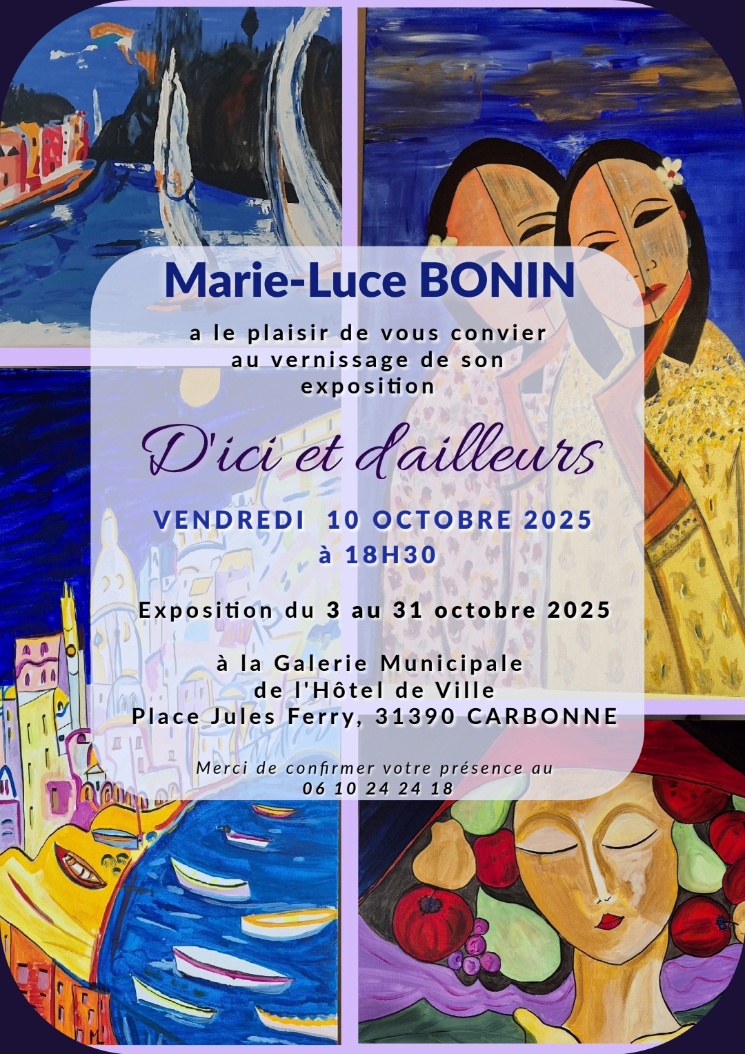 La galerie municipale de Carbonne vous propose de découvrir l'exposition "D'ICI ET D'AILLEURS" de Marie-Luce BONIN du 3 au 31 octobre 2025.