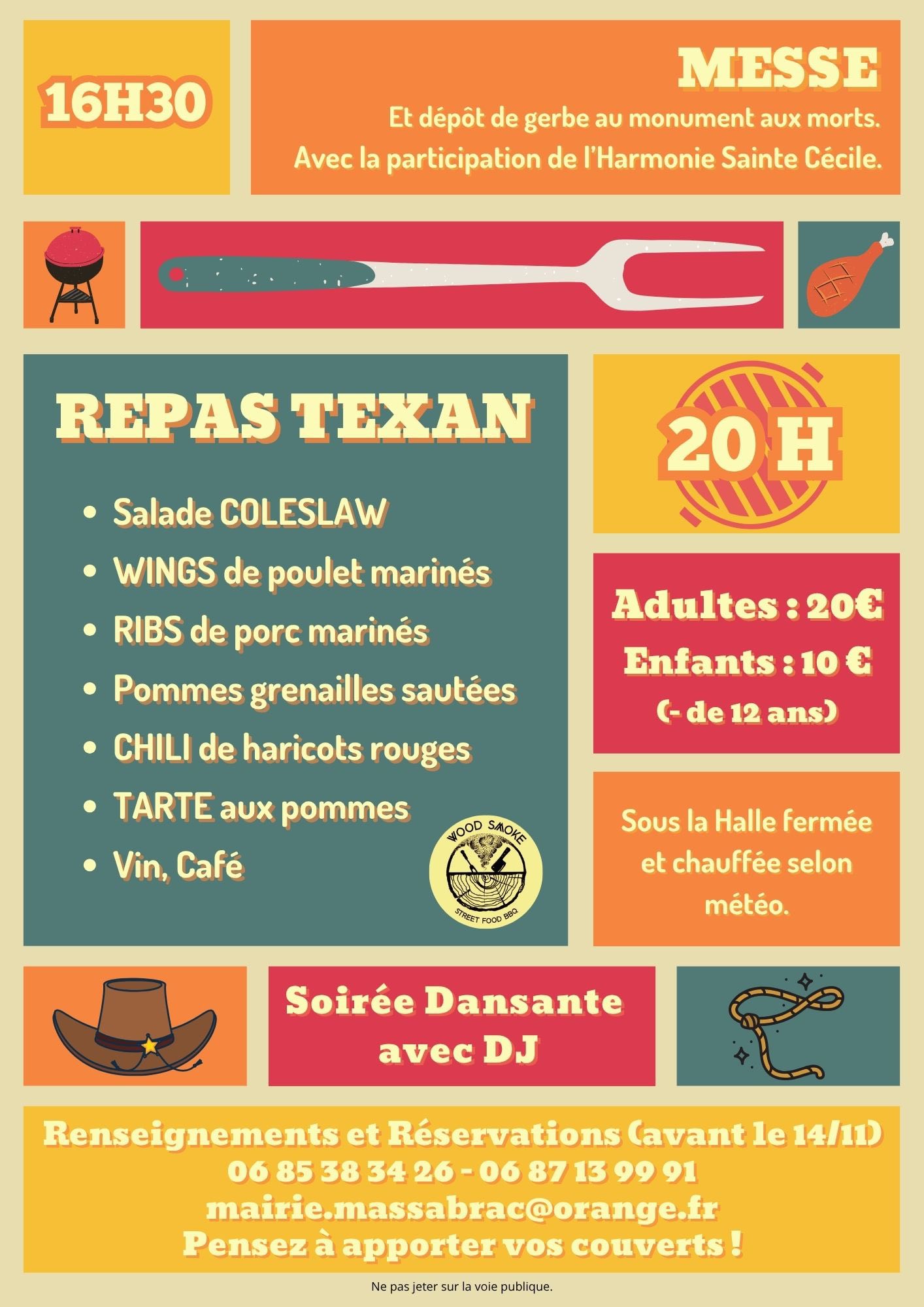 20h : Repas texan (20€ par adulte / 10€ pour les enfants de moins de 12 ans) sous la halle fermée et chauffée selon la météo.