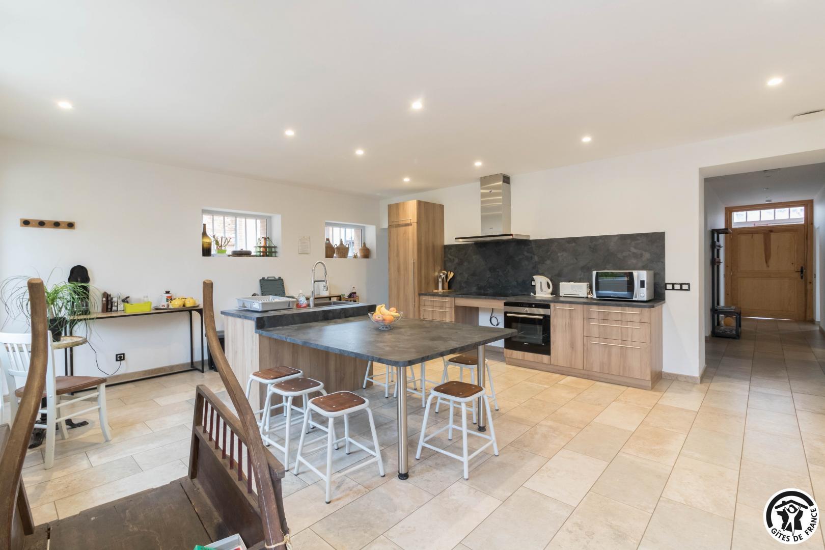 Au rez-de-chaussée : large couloir distribuant une belle cuisine ouvrant sur le jardin, une salle à manger, une chambre accessible aux personnes à mobilité réduite (1 lit pour 2 personnes en 140cm) avec sa salle d'eau/WC privative, une chambre (1 lit pour 2 personnes en 160cm) avec sa petite salle d'eau/WC. A l'étage : salon de détente, 2 chambres (1 lit pour 2 personnes en 140cm) (1 lit pour 2 personnes en 140cm + lit bébé) avec salle d'eau/WC commune, un dortoir (4 lits pour 1 personne en 90cm) avec salle d'eau. Chauffage électrique. Jardin clos à l'arrière. Pas d'accueil après 19h30. SPA du 1er mars au 15 septembre, faire une demande en dehors de ces dates.