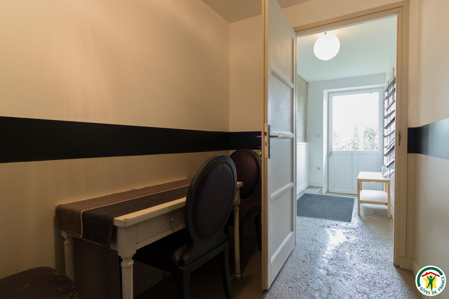 Mitoyen de la partie privative de la propriétaire où résident 2 chambres d'hôtes, le gîte fait 70m2 et est composé, au rez-de-chaussée : d'une entrée avec espace bureau pour télétravailler, d'un séjour avec coin salon, espace repas et cuisine, d'une chambre (1 lit double en 160*200cm avec bureau) et d'une salle d'eau avec douche et WC. Un escalier raide dessert une chambre (1 lit double en 140*190cm et 2 lits simples en 90*190cm, climatisation réversible) ainsi qu'un WC avec vasque. Chauffage électrique. Lave-linge en commun avec la propriétaire.