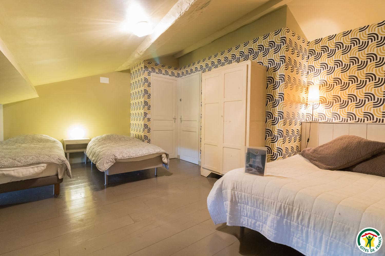 Mitoyen de la partie privative de la propriétaire où résident 2 chambres d'hôtes, le gîte fait 70m2 et est composé, au rez-de-chaussée : d'une entrée avec espace bureau pour télétravailler, d'un séjour avec coin salon, espace repas et cuisine, d'une chambre (1 lit double en 160*200cm avec bureau) et d'une salle d'eau avec douche et WC. Un escalier raide dessert une chambre (1 lit double en 140*190cm et 2 lits simples en 90*190cm, climatisation réversible) ainsi qu'un WC avec vasque. Chauffage électrique. Lave-linge en commun avec la propriétaire.