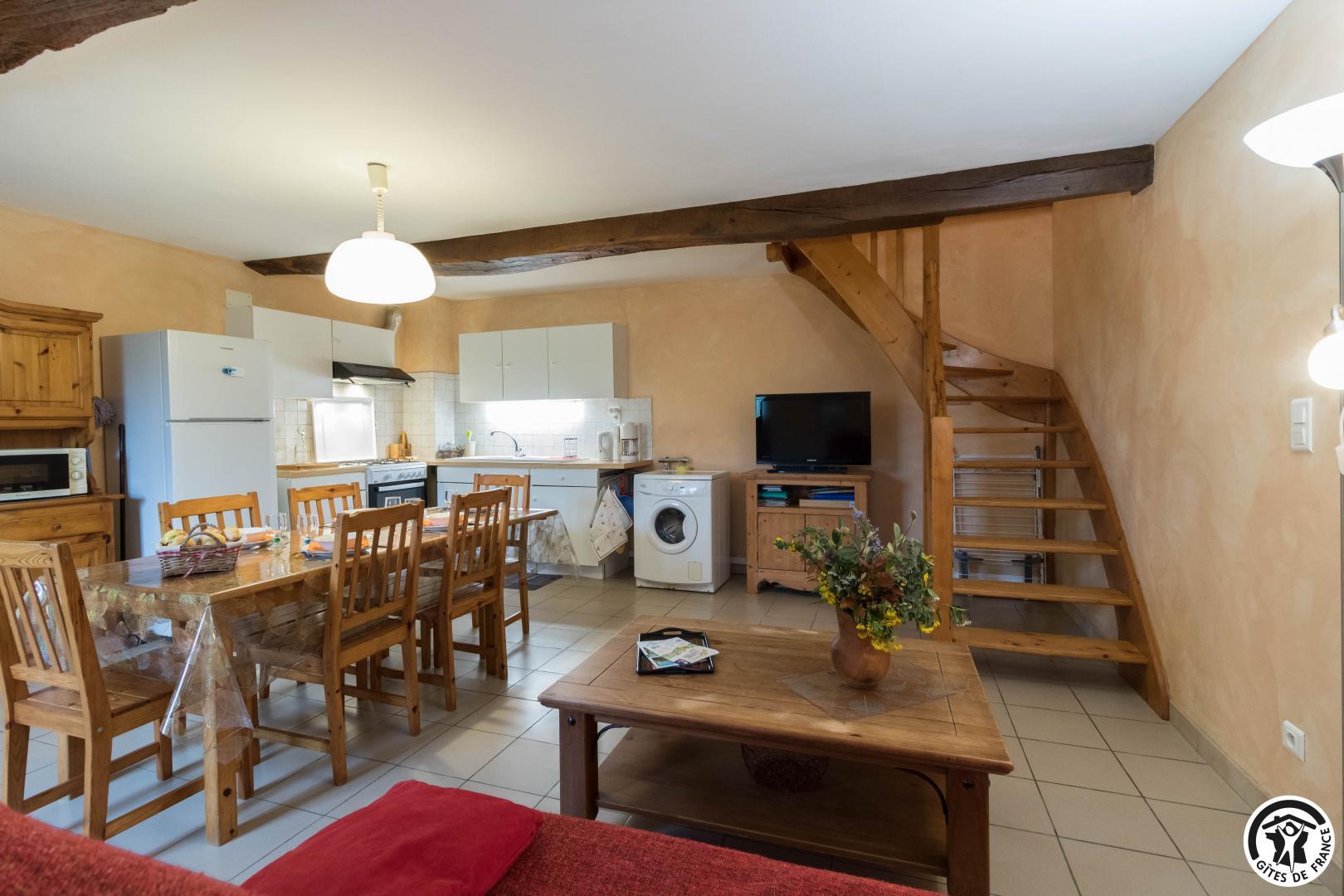 - Au rez-de-chaussée : pièce de vie avec cuisine ouverte, salle à manger et espace détente.