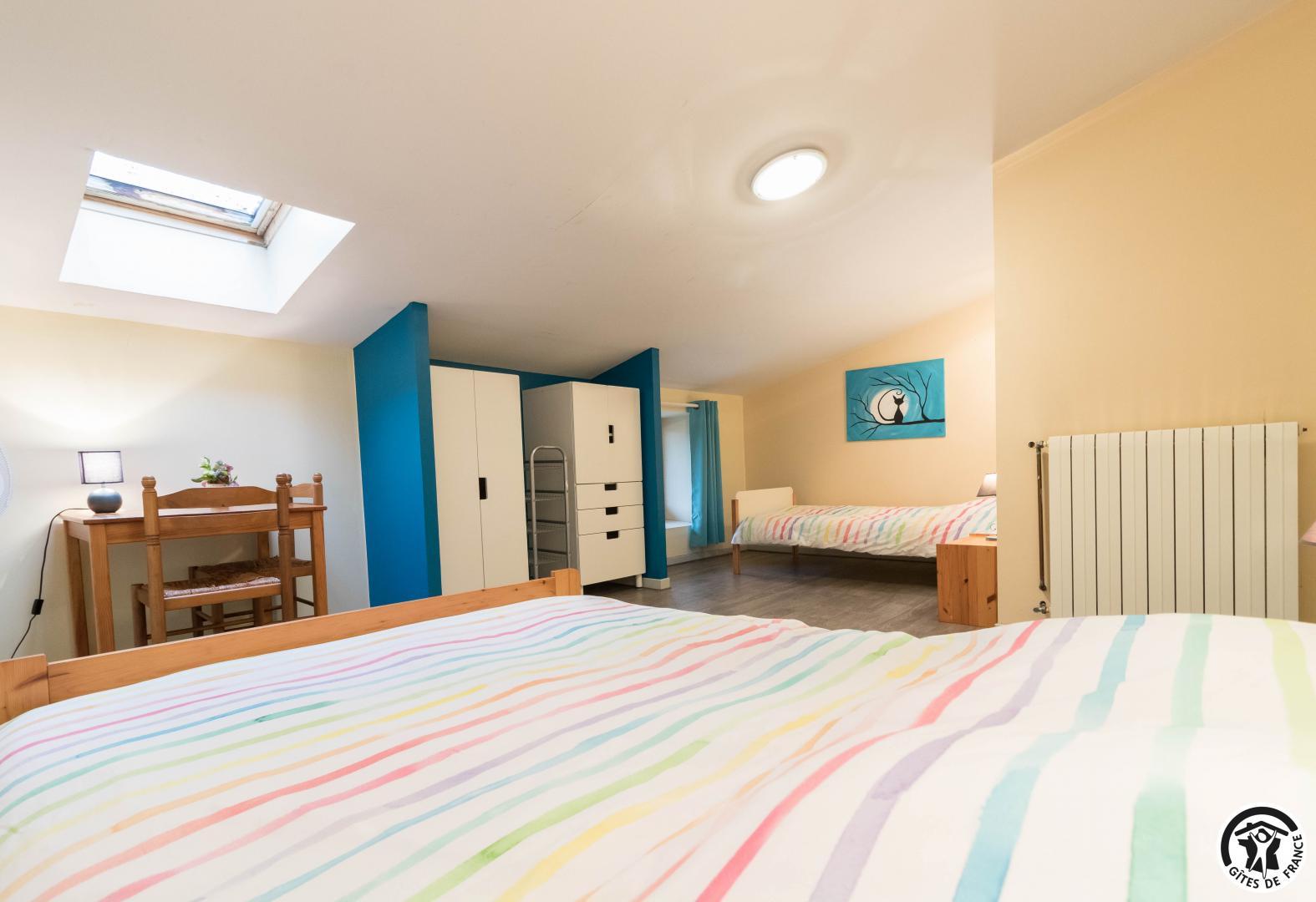 - A l'étage : 2 chambres mansardées (1 lit 2 personnes en 140cm + 1 lit 1 personne en 90cm) (1 lit 2 personnes en 140cm), salle d'eau, WC indépendant. Toutes les fenêtres et la porte d'entrée sont équipées de moustiquaires.