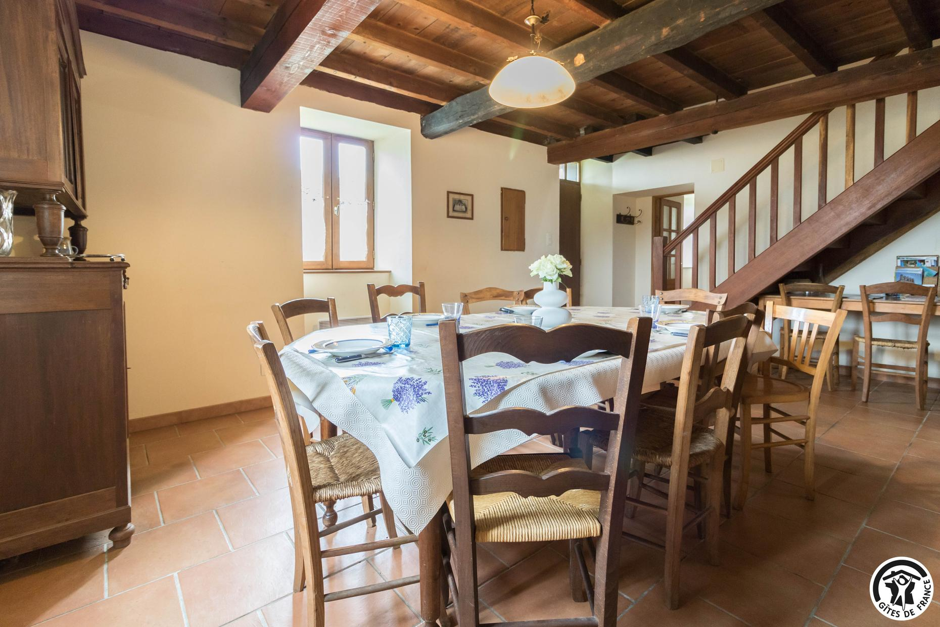 Au rez-de-chaussée : grande cuisine (réfrigérateur-congélateur, 4 plaques à induction, four, micro-ondes, bouilloire, cafetière et grille-pain) donnant sur la terrasse couverte, salle à manger (cheminée), salon (2 canapés et TV). A l'étage : chambre jaune (1 lit 2 personnes en 140cm), chambre rose (1 lit 2 personnes en 140cm) et chambre blanche (1 lit 2 personnes en 140cm + terrasse privative), salle de bains (baignoire et vasque), WC. Chauffage électrique.