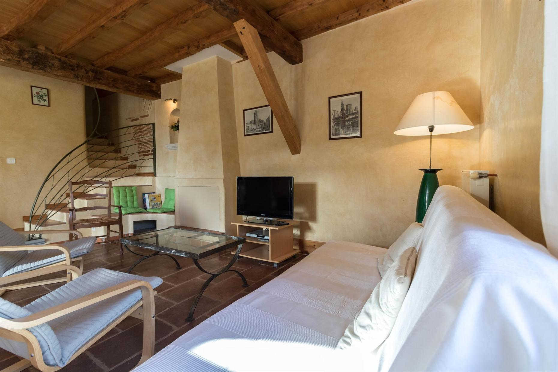 - Au rez-de-chaussée : séjour (canapé clic-clac) avec coin-cuisine, petite buanderie, WC.